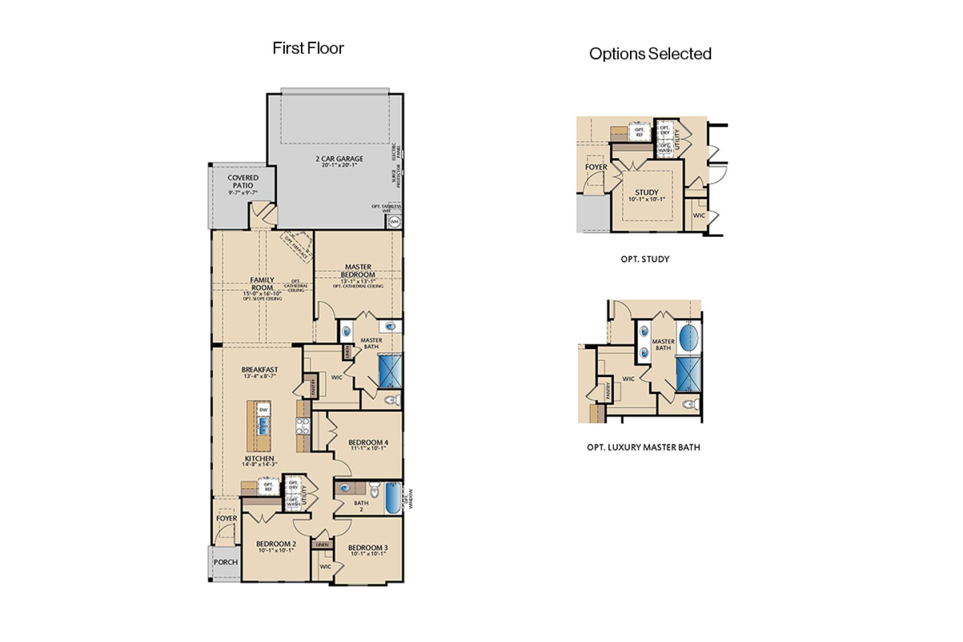 3-bedroom, 2-bath home offers single-story living with smart features and upgraded finishes throughout. In addition to the second floor media room, a private study with double doors gives you the perfect spot to work from home or set up a quiet flex space. In the kitchen, you'll find painted cabinets, quartz countertops, a white herringbone tile backsplash, and plenty of thoughtful storage—including pot and pan drawers under the gas cooktop and a roll-out trash can in the island. GE stainless steel appliances, including a built-in oven and microwave, are also included. The primary suite features a luxury bath with dual sinks, a garden tub, and a glass-enclosed tile shower. Main living areas have durable luxury vinyl plank flooring, and the family room comes prepped for a wall-mounted TV with a raised plug already in place.